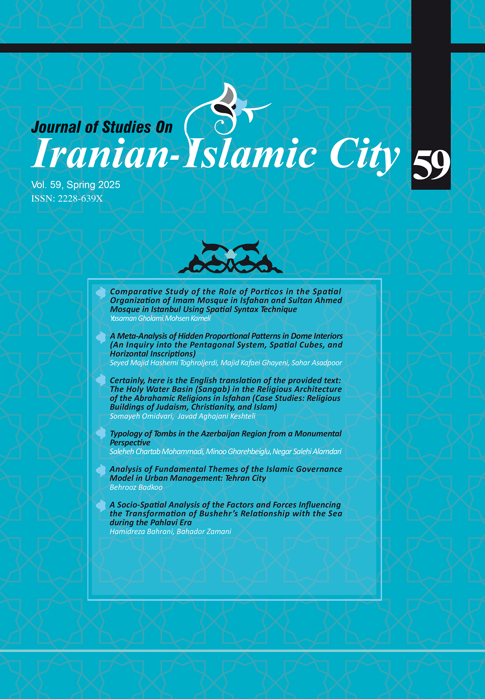 List of Articles ���������� �������������� Open Access Article Abstract Page Full-Text 1 - Evaluation of the impacts of the quality of urban third places on residents’ sense of place; Case Study: Cultural Pedestrian Zone in Rasht Ali akbar Salari pour Hamid Ramezani mehrdad mehrjou Negin Ghorban zadeh 20.1001.1.2228639.1398.10.38.3.9 Open Access Article Abstract Page Full-Text 2 - Recognizing the Position of the Minaret in the Architecture of Mosques from the Point Of View of Shiite Jurisprudence amir Sadeghi nejad Abas Masoudi 20.1001.1.2228639.1398.10.37.1.5 Open Access Article Abstract Page Full-Text 3 - The comparative study of Arabian-Islamic Urban pattern with Iranian-Islamic Urban pattern (case study: Khartoum and shiraz) علی احمدیان کیسمی Open Access Article Abstract Page Full-Text 4 - Analysis of the executive system of renovation plans in worn-out urban textures with emphasis on worn-out textures of Tehran; Case study: Safa and Shahid Asadi neighborhoods Hossein Kalantari Khalilabad Mahdi Haghi 20.1001.1.2228639.1399.11.41.1.0 Open Access Article Abstract Page Full-Text 5 - Assessing the contextualism of contemporary infills in the historical context of the traditional Ardabil bazaar, emphasizing the fractal dimension Seyede Elham Alavizadeh seyed gholamreza Islami 20.1001.1.2228639.1398.10.37.3.7 Open Access Article Abstract Page Full-Text 6 - Preparation principle for Mohallah Playground Design, With Emphasis on Revival of Irainian Native Games; Case Study: Mohallah of Bagh-feyz in Tehran Majid Khoramshad Seyed ali Safavi 20.1001.1.2228639.1398.9.36.2.1 Open Access Article Abstract Page Full-Text 7 - Spatial Dynamics of Islamic City Based on Complexity Theory; Case Study: Tehran Central District Hossein Hataminejad Ahmad pourahmad Keramatalah Zayyari Hosein Behbodi Moghadam 20.1001.1.2228639.1398.10.37.4.8 Open Access Article Abstract Page Full-Text 8 - The Impact of Megamalls on the Neighborhood Identity in Tehran; Case study: Atlas Mall Esmaeil Shiee Mahsa hajiani 20.1001.1.2228639.1398.9.36.6.5 Open Access Article Abstract Page Full-Text 9 - Socialization in Iranian Governmental Organizations and Its Role in Citizenship Ethics in the Islamic Iranian City غلامرضا مقدم سیف اله سیف اللهی محمدرضا جوادی یگانه Open Access Article Abstract Page Full-Text 10 - New discoveries Architecture from the Late Sassanid and Early Islamic period in the Seimare River Basin(Central Zagros) Mahnaz sharigi 20.1001.1.2228639.1398.9.36.5.4 Open Access Article Abstract Page Full-Text 11 - Analysis of cemeteries organizing in Isfahan city from the perspective of the Islamic Iranian city pattern Asghar Montazer alghaeem Fardin Koshki 20.1001.1.2228639.1398.9.36.4.3 Open Access Article Abstract Page Full-Text 12 - Principles and strategies for designing infill structures as driving development of historic fabrics Maryam Anjoman Shoae Piroz Hanachi Elham Andarodi 20.1001.1.2228639.1398.10.37.6.0 Open Access Article Abstract Page Full-Text 13 - Religious Spaces in the Layout and Fabric of Zoroastrian Cities; Case Study: Yazd hassan karimian Fatemeh karimi 20.1001.1.2228639.1398.10.37.2.6 Open Access Article Abstract Page Full-Text 14 - Reviving the identity of the historical texture of city with an emphasis on organizing the physical and Visual System Case Study: Historical Square of VIJUYEH , Tabriz Shahryar Shaghaghi Samaneh Mahdinezhad 20.1001.1.2228639.1399.11.41.6.5 Open Access Article Abstract Page Full-Text 15 - The role of Egalitarianism and Hospitality on continuity of residence in Gomishan’s Hananeh Malak Mohamadi Bidhendi Hossein Soltanzadeh Maryam Armaghan 20.1001.1.2228639.1398.9.36.3.2 Open Access Article Abstract Page Full-Text 16 - The analysis of the spatial structure of Qom metropolis with emphasis on the formation of sub-cores Mohammad soleimani mosa kamanrodi Mazhar Ahmadi Ahmad Zanganeh 20.1001.1.2228639.1398.9.36.1.0 Open Access Article Abstract Page Full-Text 17 - Elucidation of the physical patterns of contemporary housing based on the contextual architecture in Kashan; Case study: Selected historical houses of the Qajar dynasty Hossein kalantari Seyed Amir nezam dost Ali yaran 20.1001.1.2228639.1398.10.38.1.7 Open Access Article Abstract Page Full-Text 18 - Studying and recognizing the structural system and the formation pattern of Khan Garden of Shushtar; A distinct type of Iranian gardening Mohammad Ebrahim Mazhary Amin Maghsoudi Fatemeh Poodat 20.1001.1.2228639.1399.11.41.2.1 Open Access Article Abstract Page Full-Text 19 - A Review of the Semantic and Physical Structure of Sacred Places Inviolable Zone; Based on Works of Travel Literatures written from the fifth to the fourteen centuries A.H Mohamad Saeed izadi Nasim Asgari Shahriar Nasekhian 20.1001.1.2228639.1398.10.38.2.8 Open Access Article Abstract Page Full-Text 20 - Cultural Analysis of Space in In Kurdish Residential Architecture; Case Study: Traditional Houses in Mukrian (The City of Sardasht) Elham Rashidzadeh Foad Habibi 20.1001.1.2228639.1399.10.40.2.6 Open Access Article Abstract Page Full-Text 21 - Revisiting the Spatial Organization of Neighborhoods in the Iranian City in Terms of the Tradition of Mortmain; Case Study: Aligholi Agha neighborhood, Isfahan Mina Kashani Hamedani Hassan Sajjadzadeh 20.1001.1.2228639.1399.10.40.3.7 Open Access Article Abstract Page Full-Text 22 - Recognition of the semantic components the Iranian-Islamic city Alleys; Case study: Historical context of Sari city Rasoul Abdi Malek Kalaei Abdolmajid Noortaghani Mahdi Sadvandi 20.1001.1.2228639.1399.10.40.5.9 Open Access Article Abstract Page Full-Text 23 - Recognition of the area and elements of Isfahan’s Lonban neighborhood in the Qajar period Mahsa Payedar Mohsen Afshary 20.1001.1.2228639.1399.10.40.1.5 Open Access Article Abstract Page Full-Text 24 - Explaining an Enduring indicators of Iranian vernacular housing using Gro